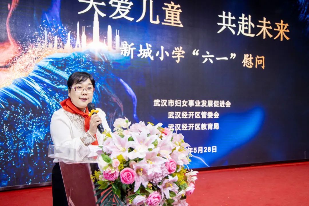 武汉经开区教育局党委书记、局长熊白莉上台致辞。她指出,武汉市妇女事业发展促进会与各位市老领导来到经开区新城小学开展捐赠慰问活动,充分展现了对经开区教育工作的厚爱和对孩子们健康成长的期望。希望新城小学以此次活动为新起点,落实好立德树人根本任务,继续秉承“快乐童年 多彩人生”的办学理念,用好捐赠的教育资源,将足球这一办学特色发扬光大,用优秀的办学成果回馈各级领导和社会各界的关心支持。